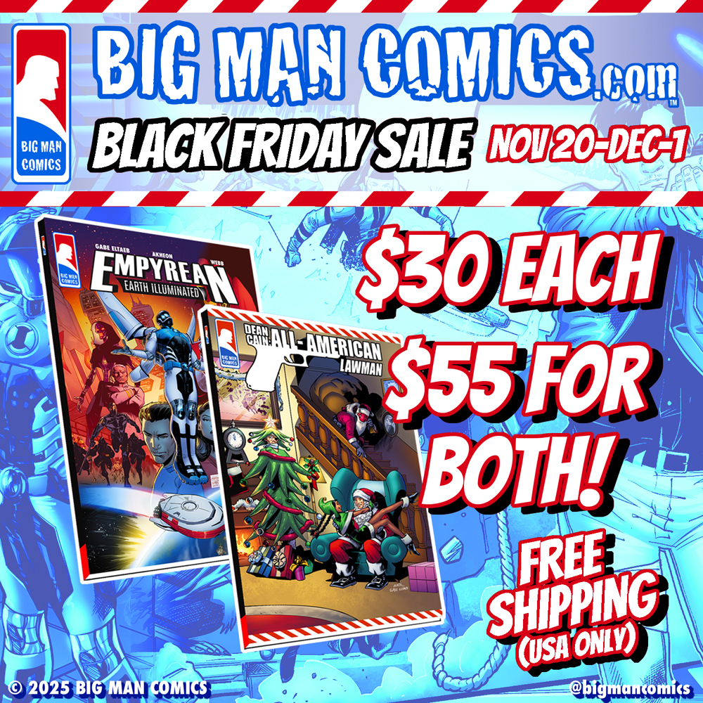 Black Friday Christmas sale now live through December 1. Get both critically acclaimed Big Man Comics graphic novels, Dean Cain All-American Lawman with the exclusive Christmas cover and Empyrean: Earth Illuminated (choose Cover A or Cover B), together for only $55 with FREE SHIPPING in the USA and guaranteed delivery by Christmas. Limited stock available. USA only.