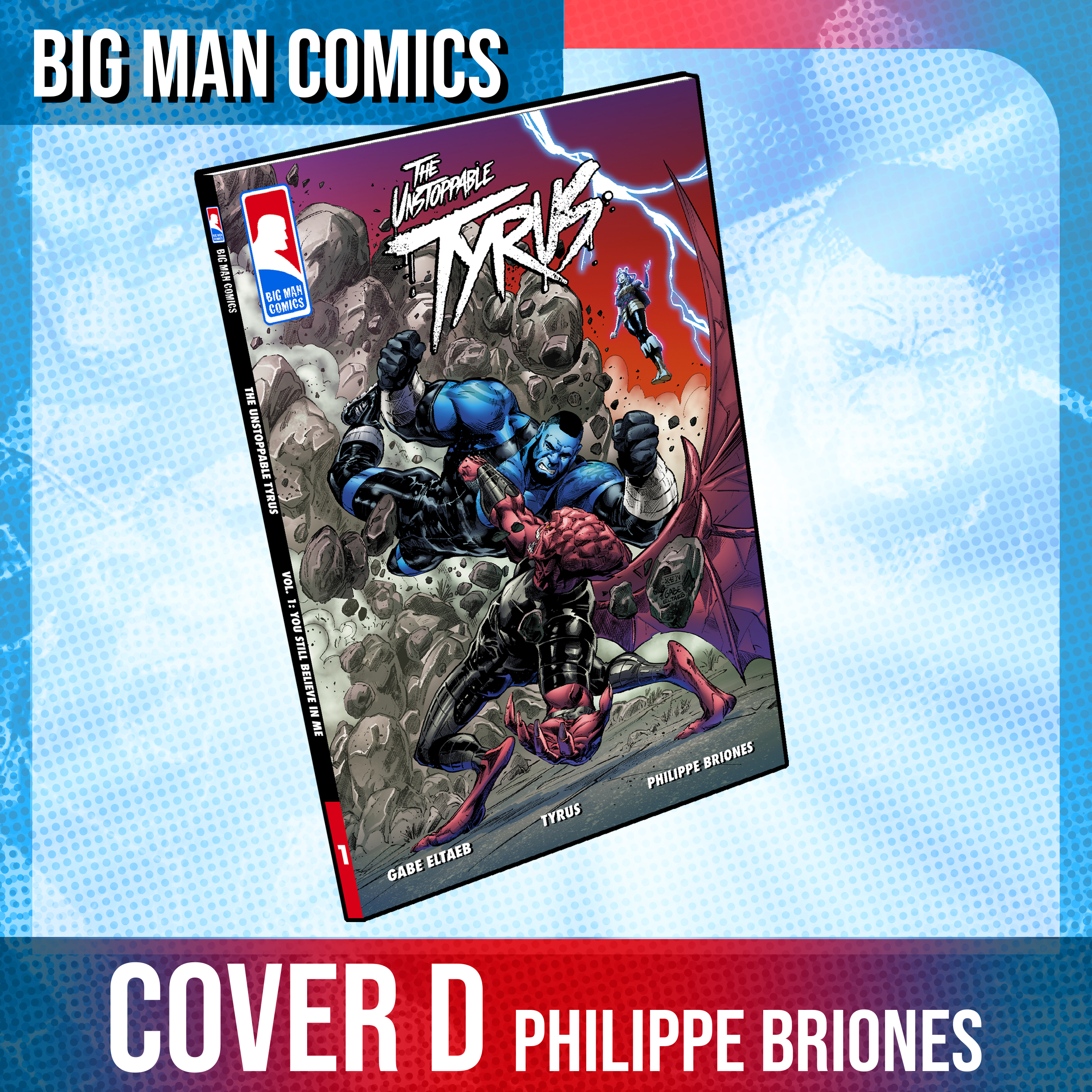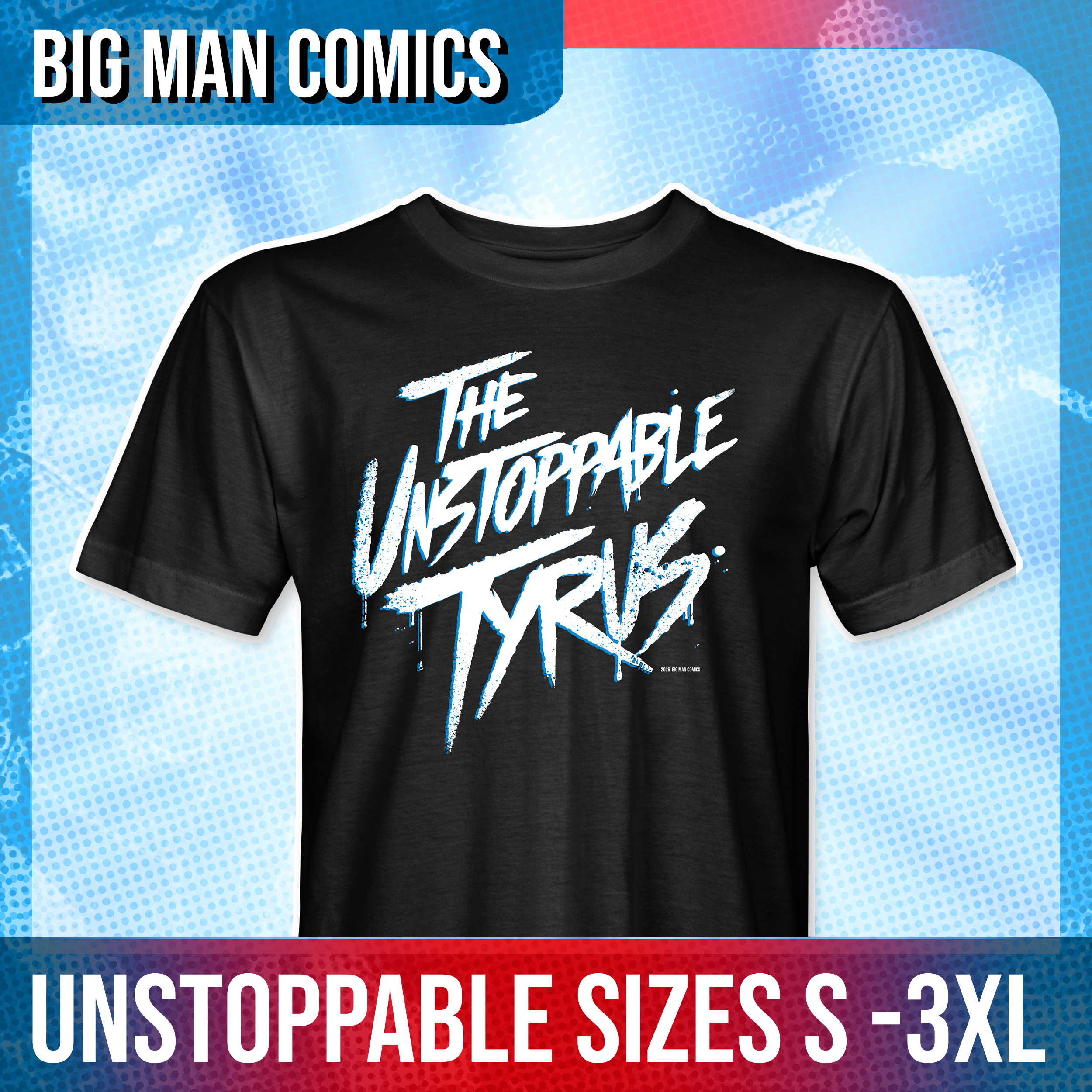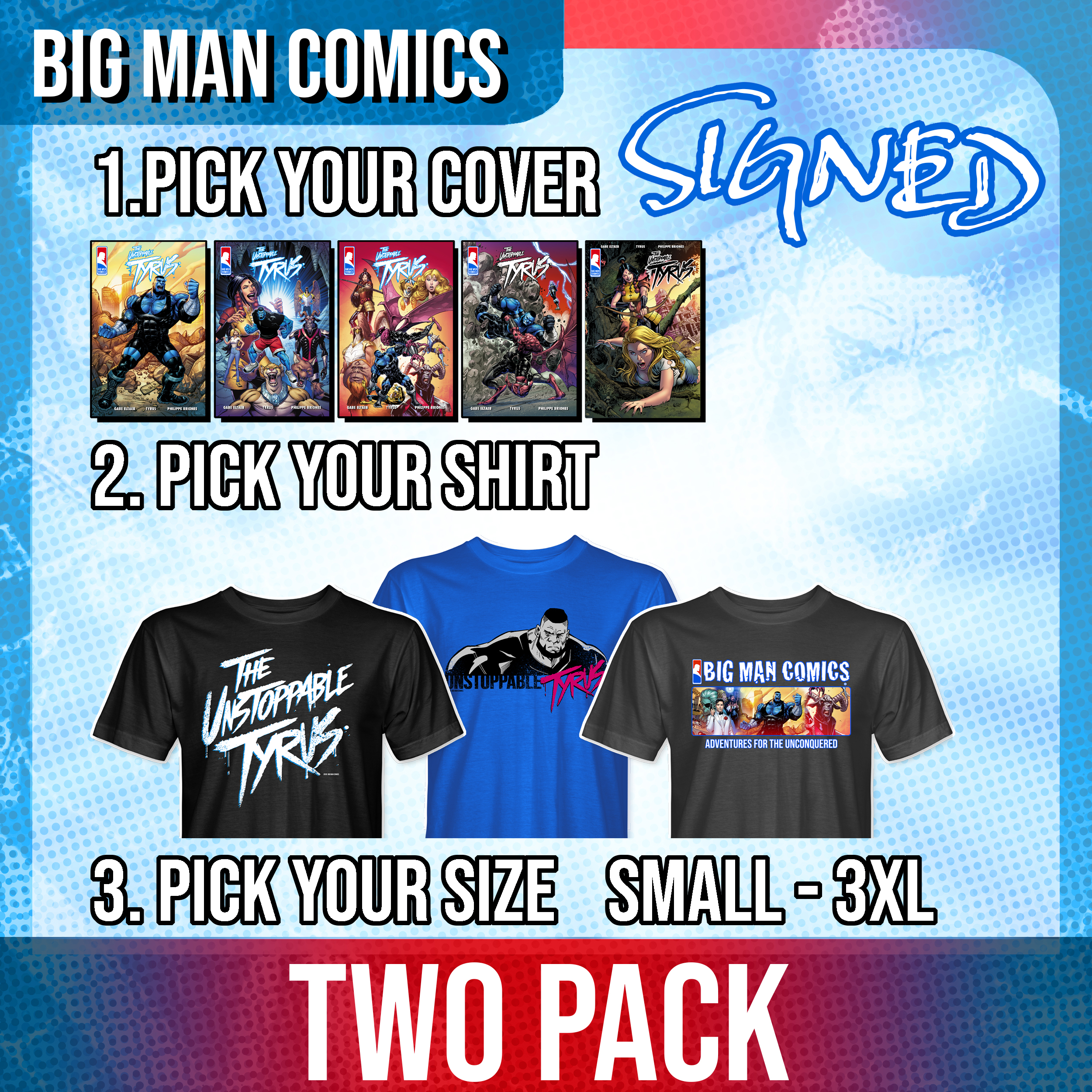 One copy of The Unstoppable Tyrus 128 page graphic novel with the cover of your choice from A-E and one t-shirt of your choice, the classic Unstoppable, the Scowl, or the Big Man Comics t-shirt in the size of your choice, S-3XL.
